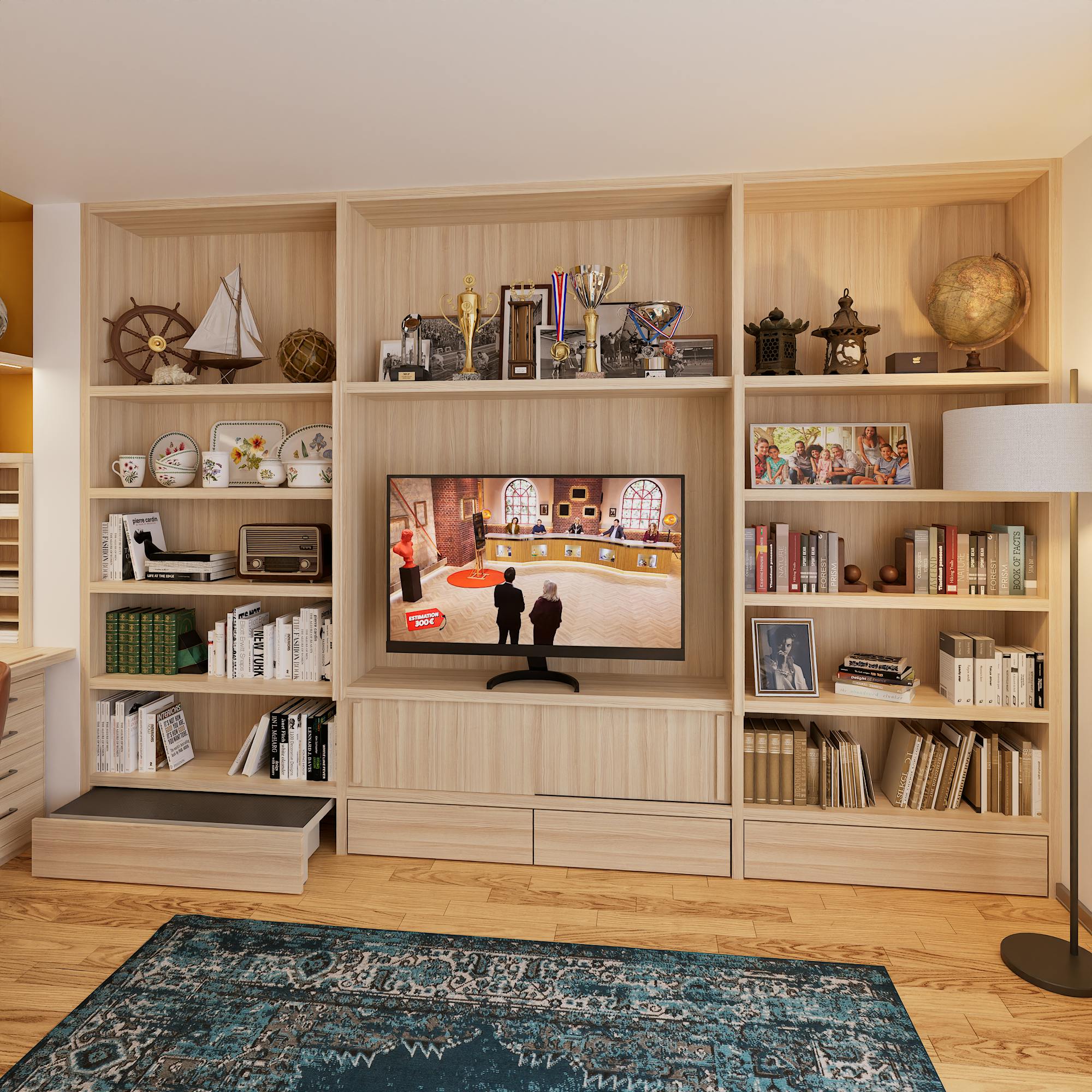 Avec ses éléments fonctionnels, cette bibliothèque s’impose comme un véritable atout pour l’aménagement du salon. Les larges zones de préhension intégrées réduisent le risque de chute, tandis que le marche-pied intégré libère l’accès aux espaces de rangement les plus élevés. Une conception astucieuse qui fait de ce meuble bien plus qu’un simple rangement : un véritable allié du quotidien, pensé pour durer.