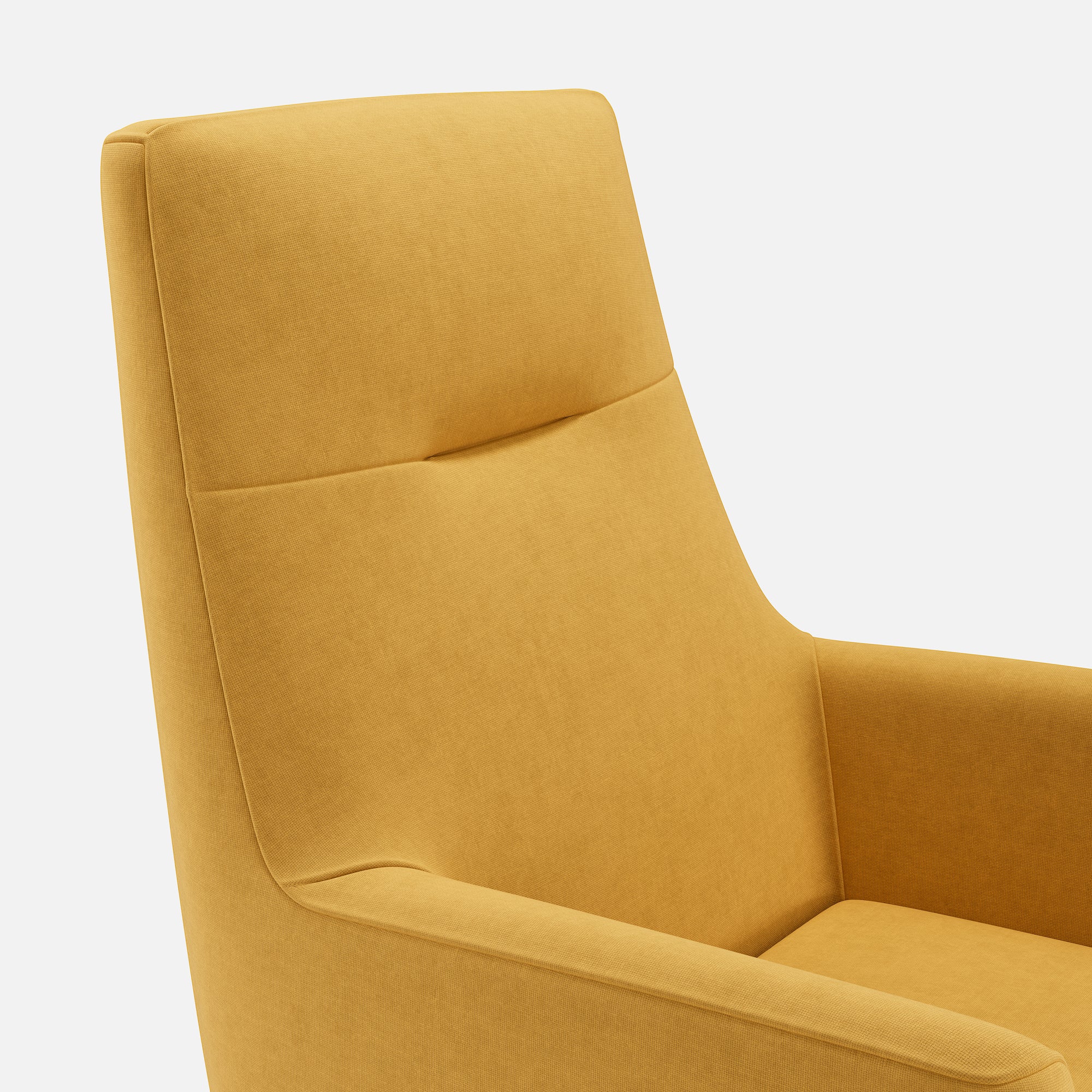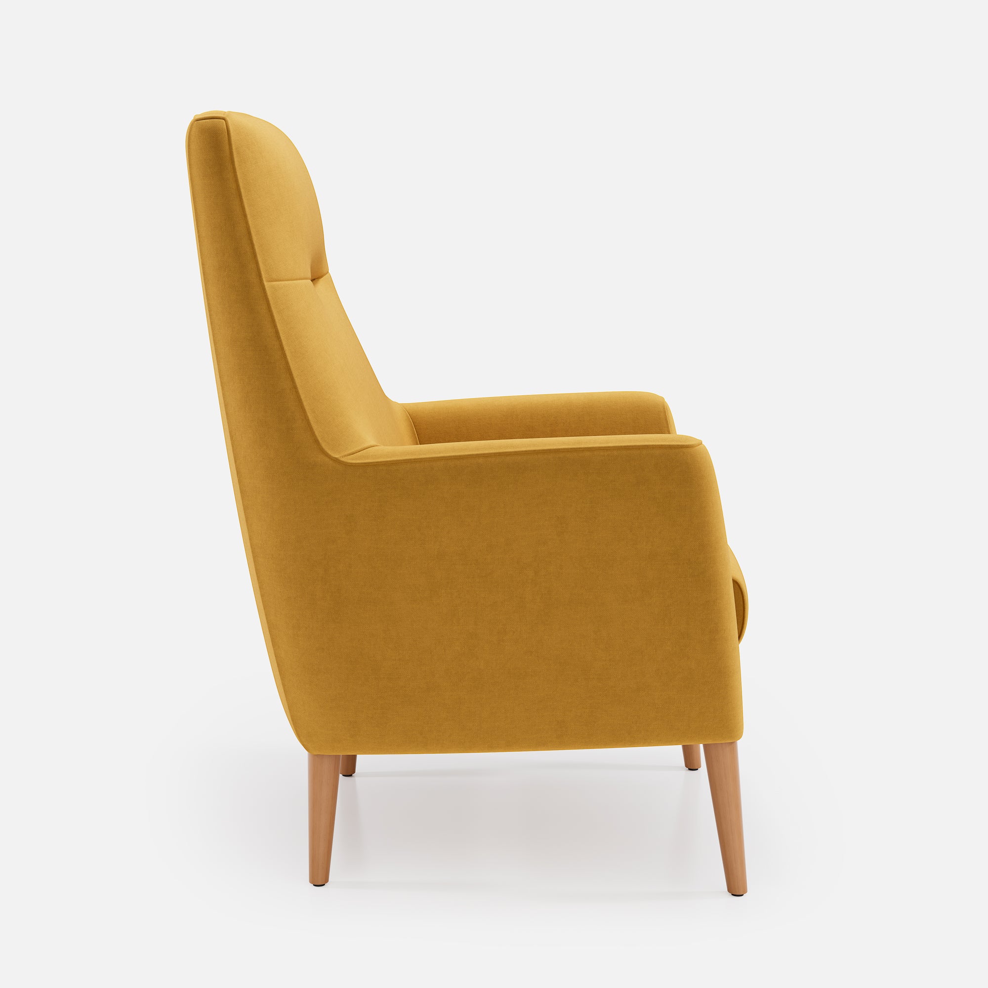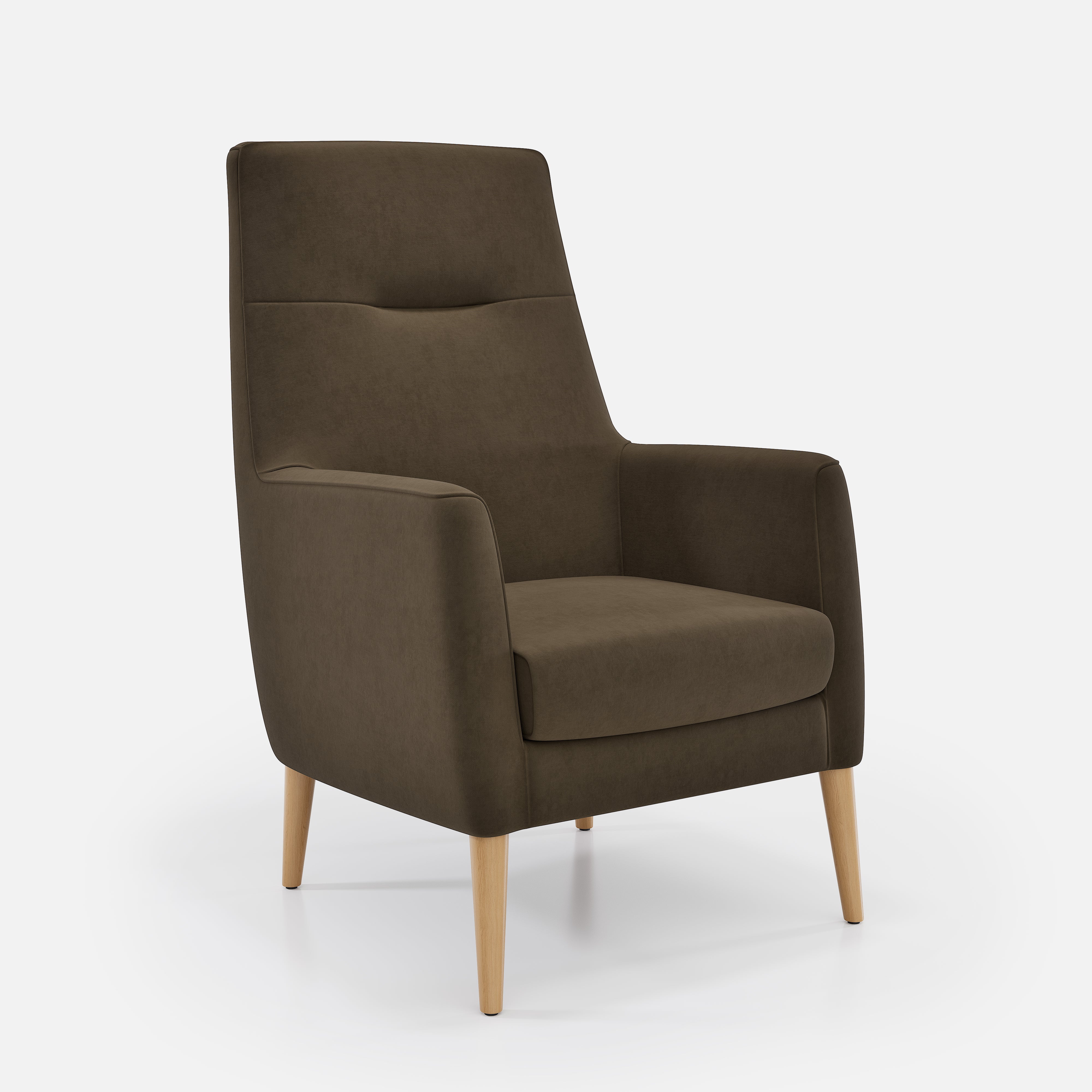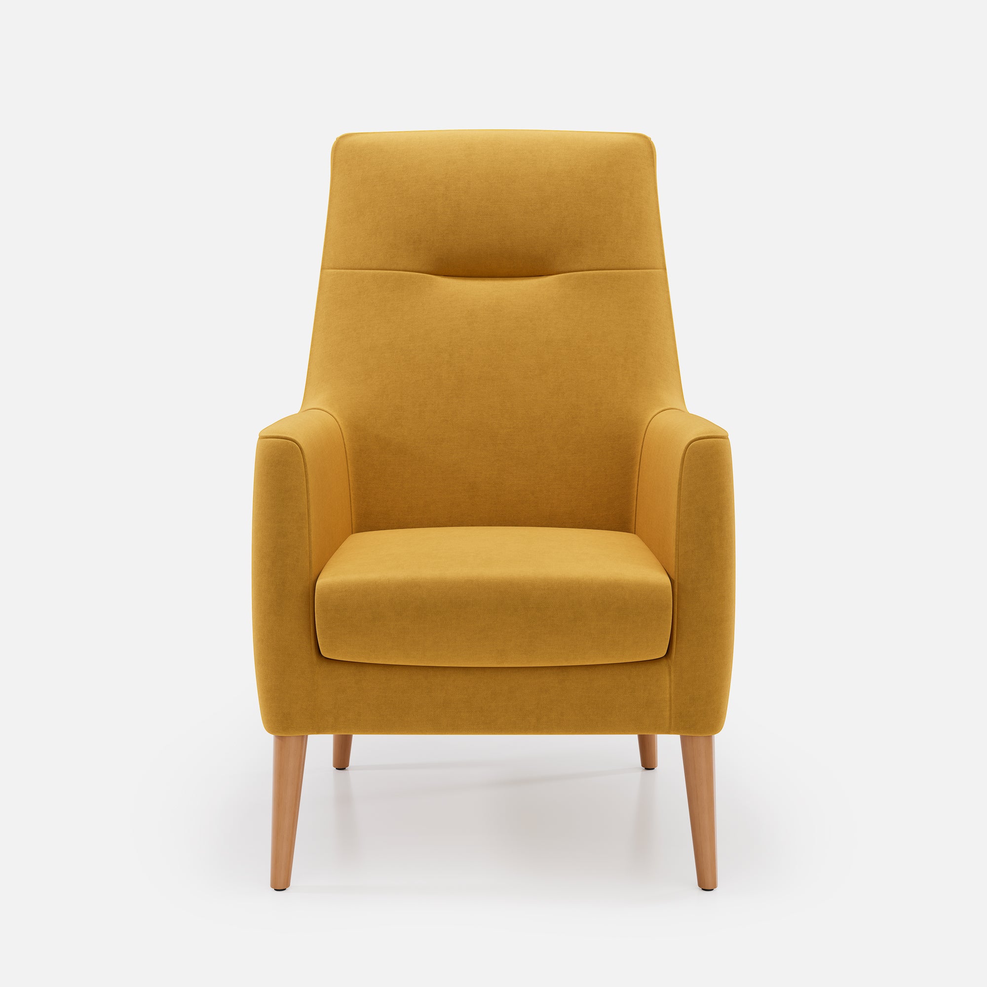 Disponible avec des pieds en bois dotés d’une structure croisée, offrant une grande stabilité et garantissant que le fauteuil s’adapte parfaitement à vos préférences esthétiques.