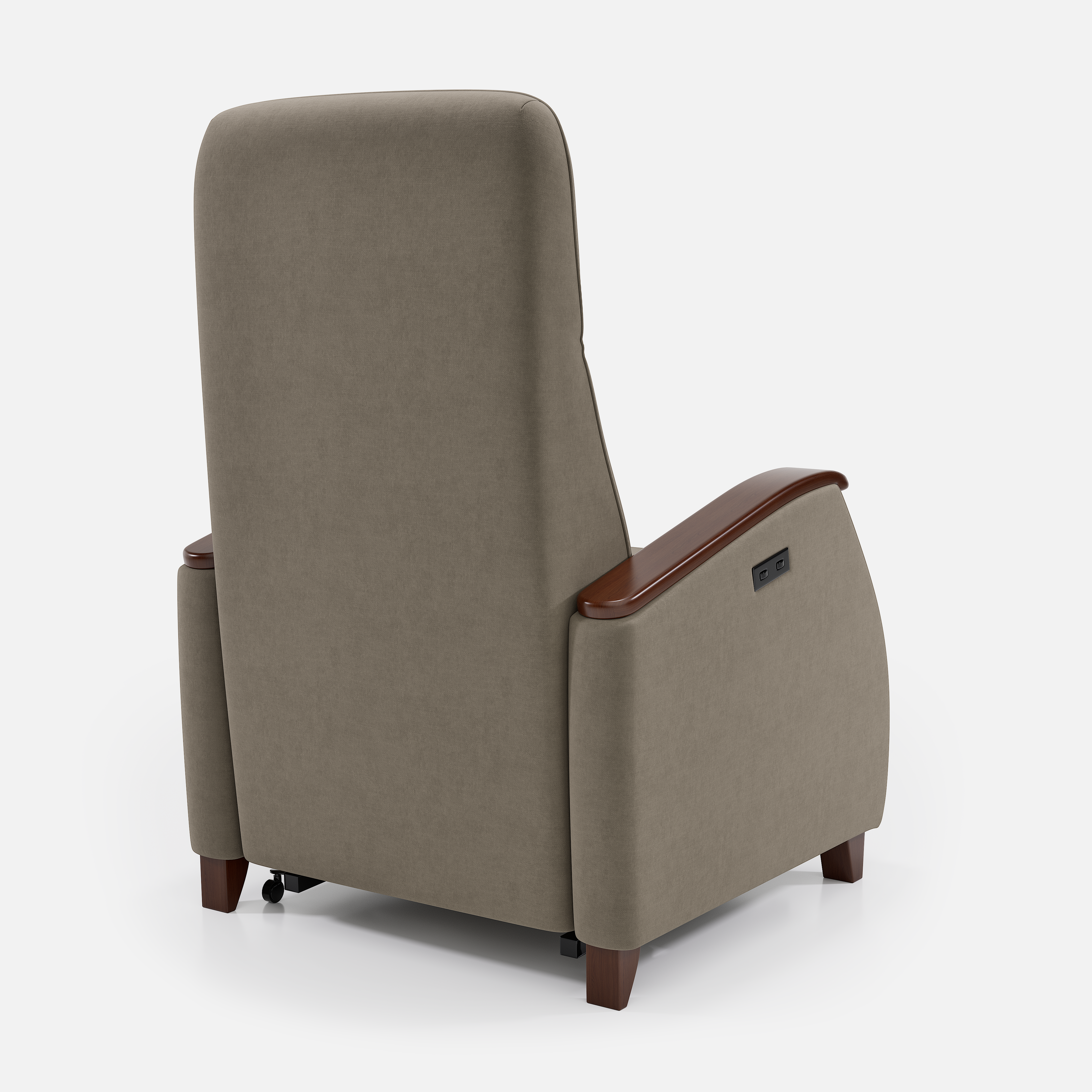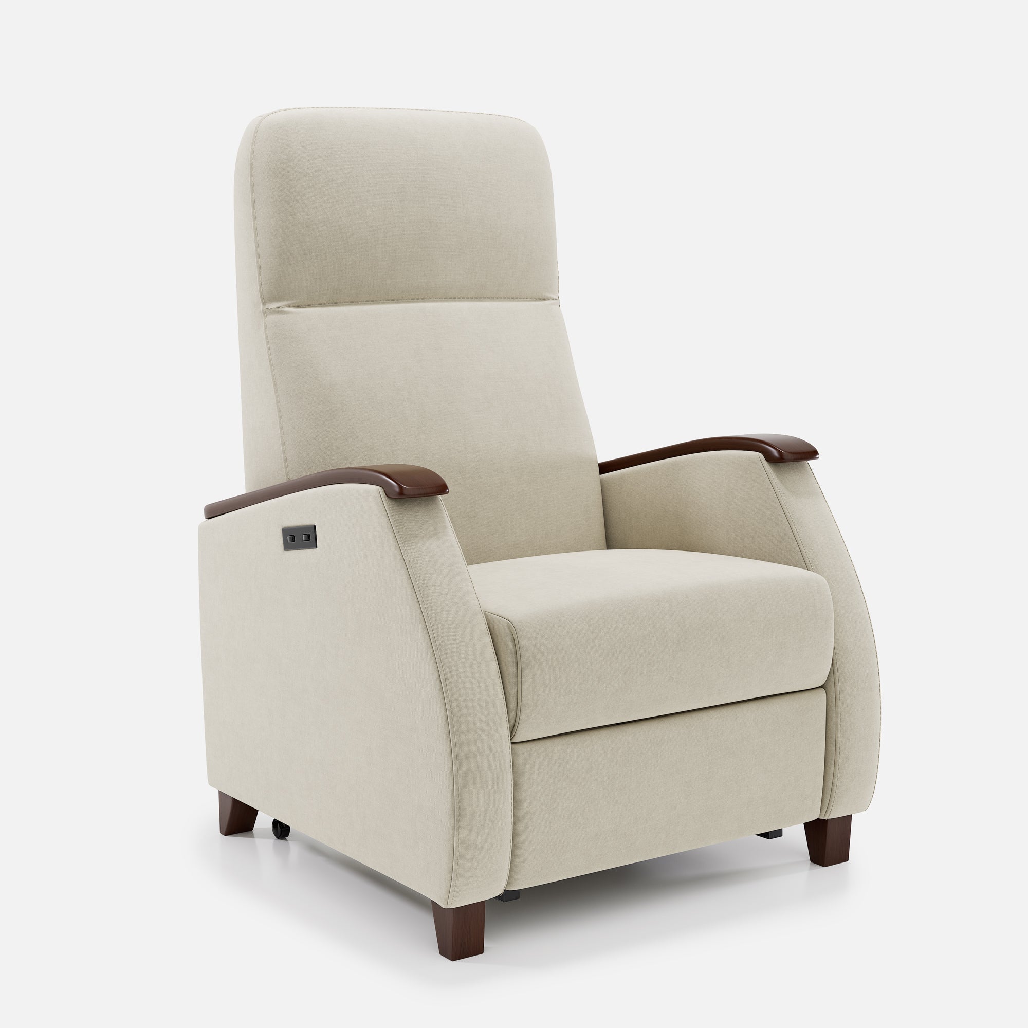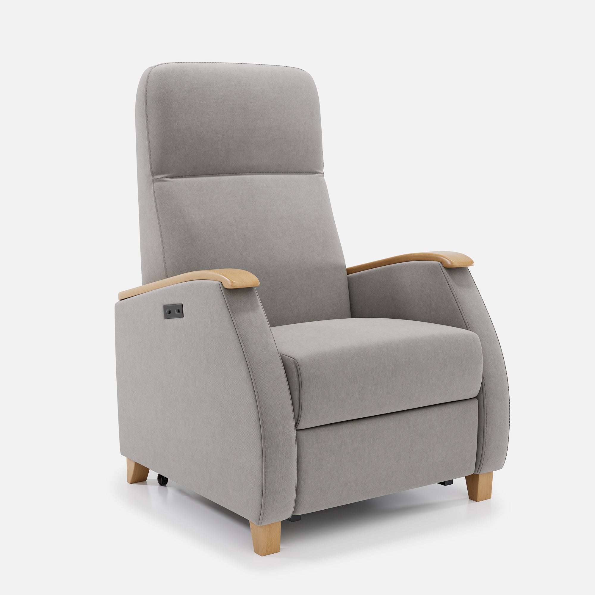 Les accoudoirs rembourrés et recouverts de bois massif permettent de les saisir très facilement et fermement. En complément de la fonction releveur qui soulève doucement le fauteuil pour vous accompagner en position debout, ils sont un appui fiable et idéalement positionné pour se lever de son fauteuil.