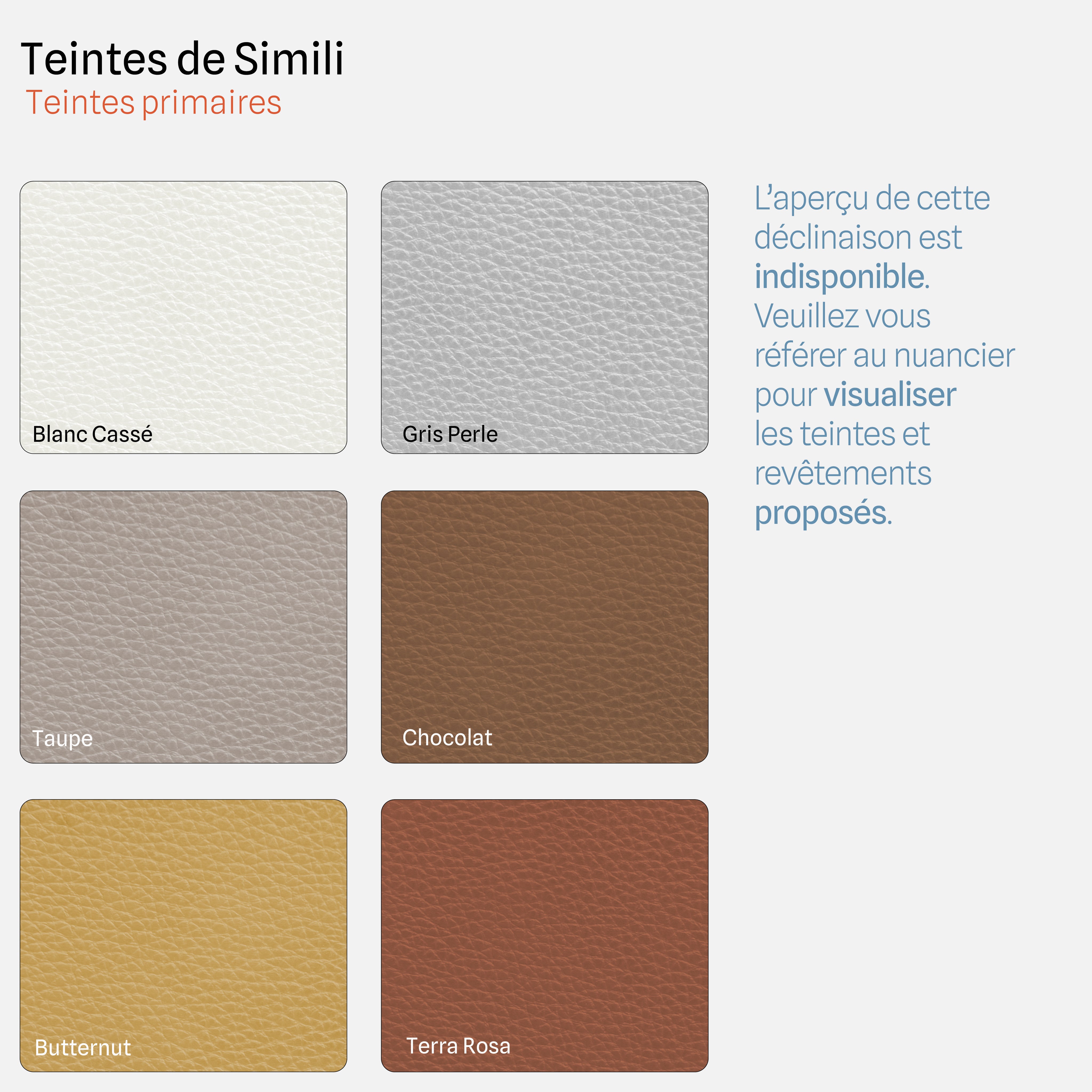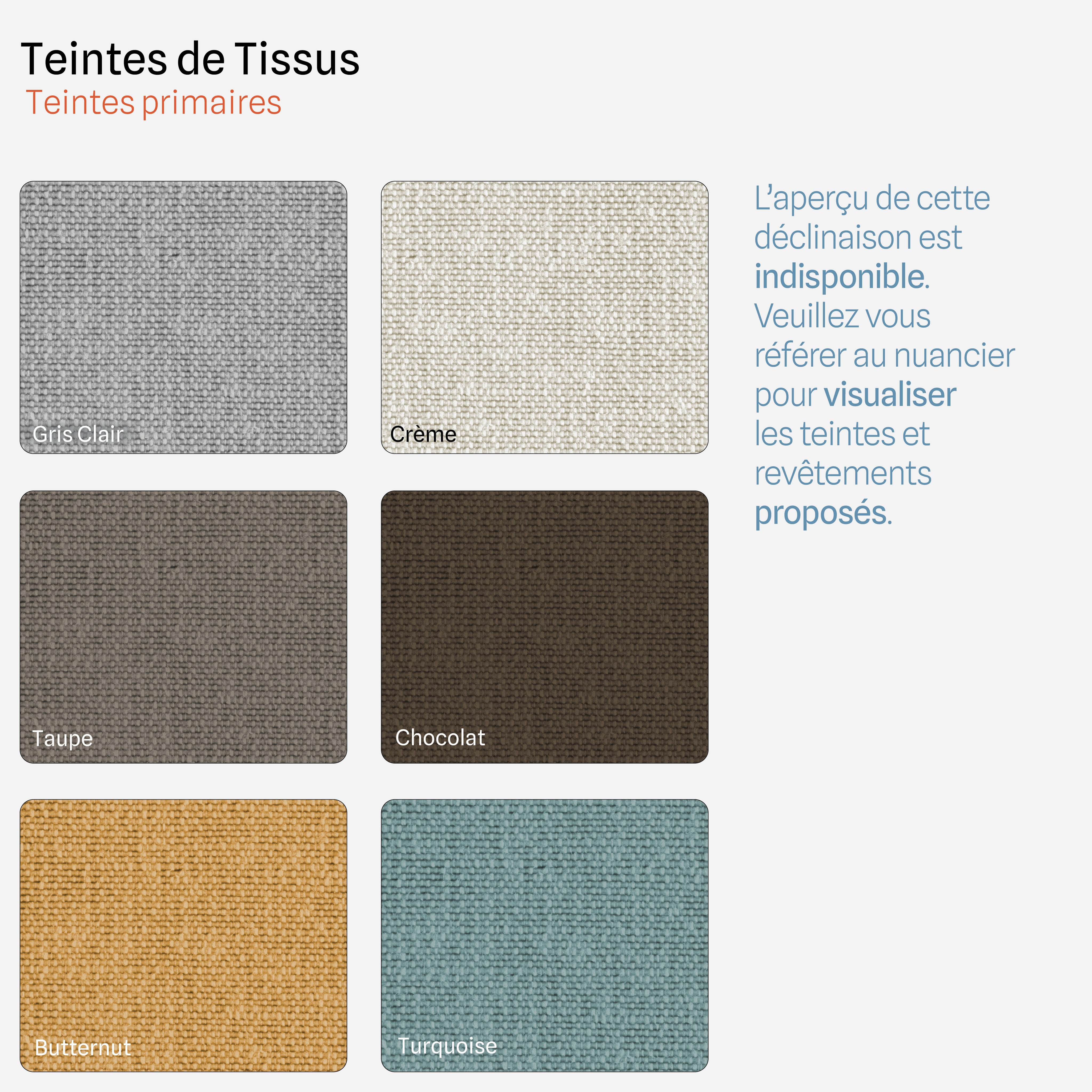 Disponible en 6 coloris de tissus et 6 coloris de simili cuir.
