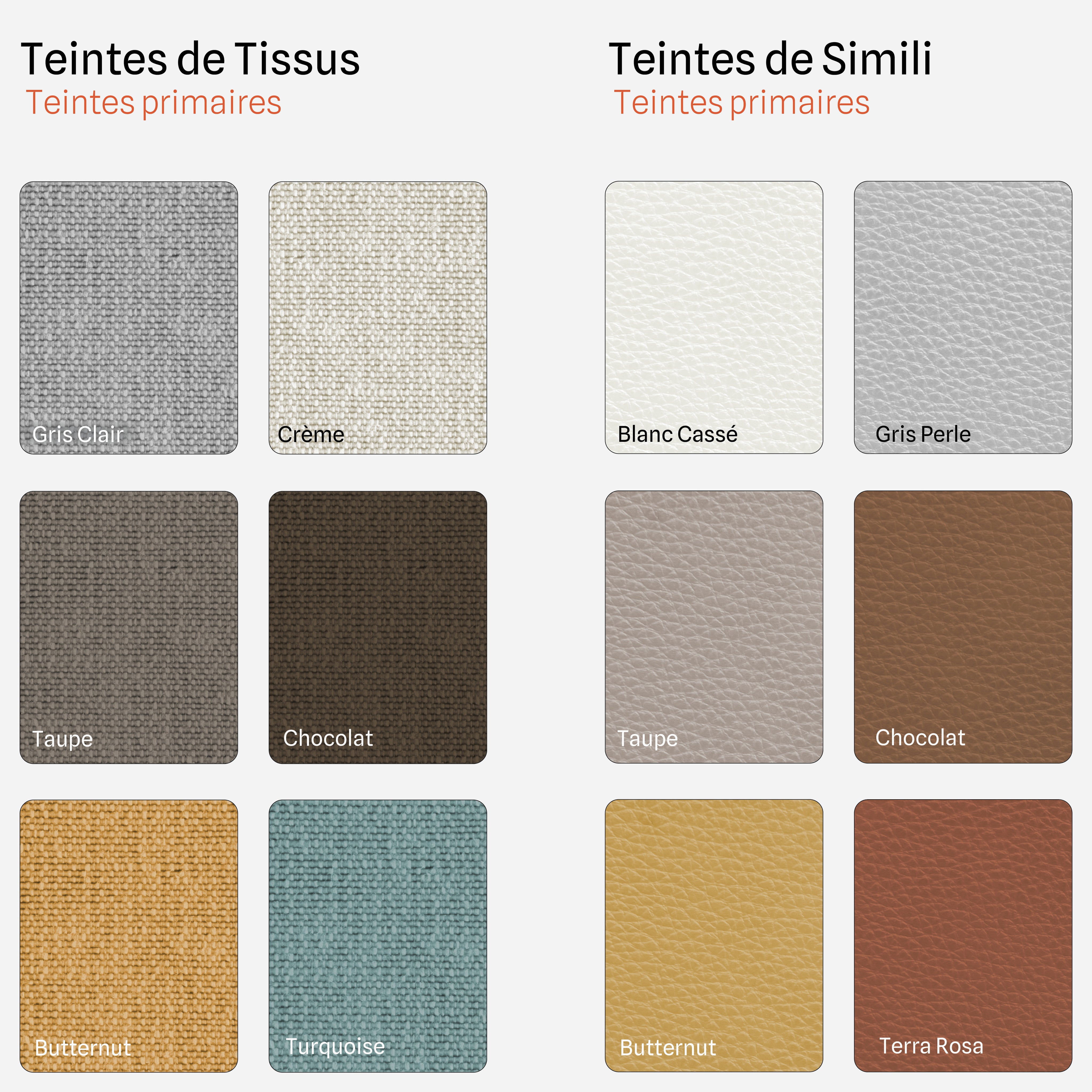Disponible en 6 coloris de tissus et 6 coloris de simili cuir.