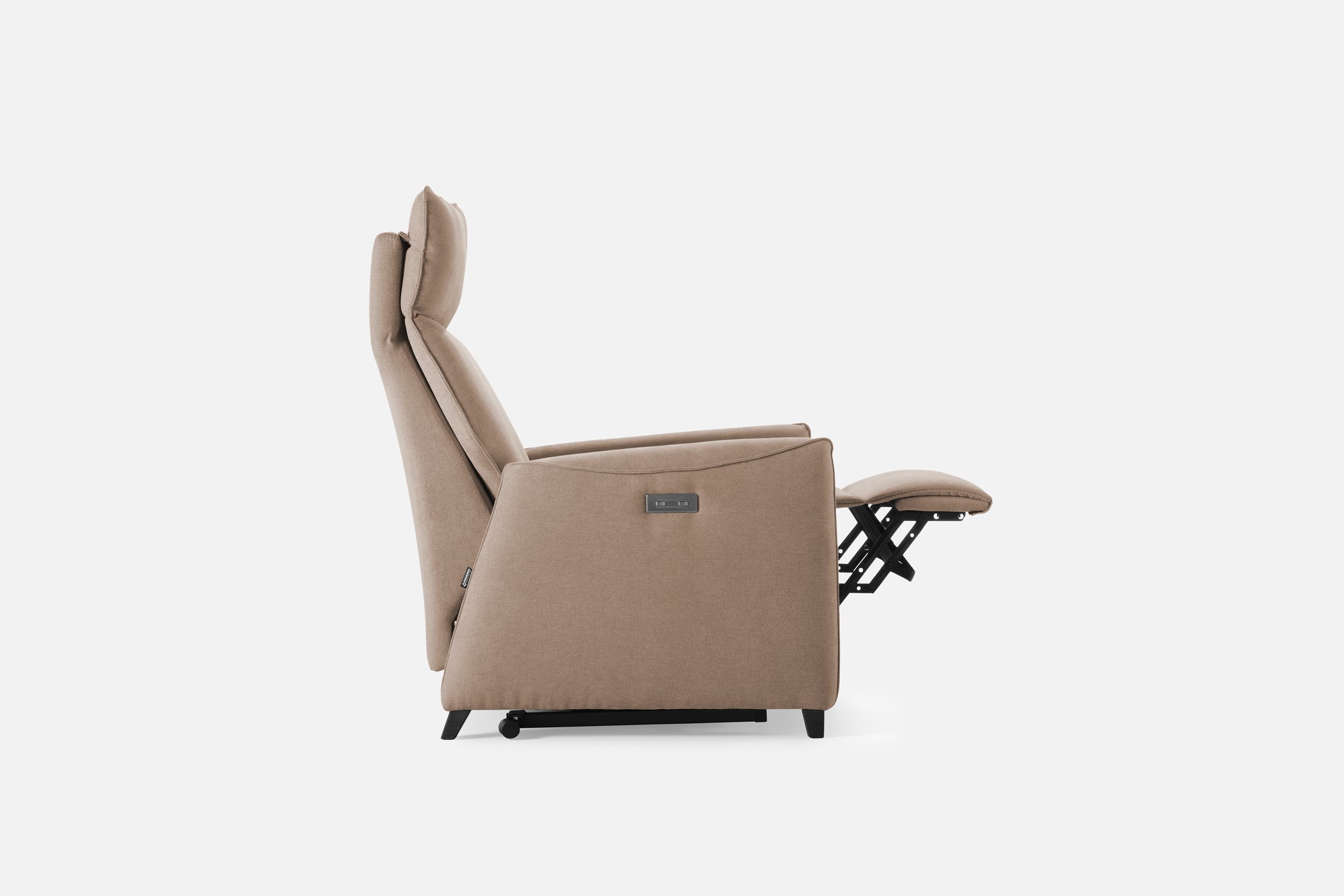 En version électrique, une simple pression sur les commandes intégrées au côté du fauteuil permet d’incliner simultanément le dossier et de déployer le repose-pieds pour passer d’une position assise à une détente complète.