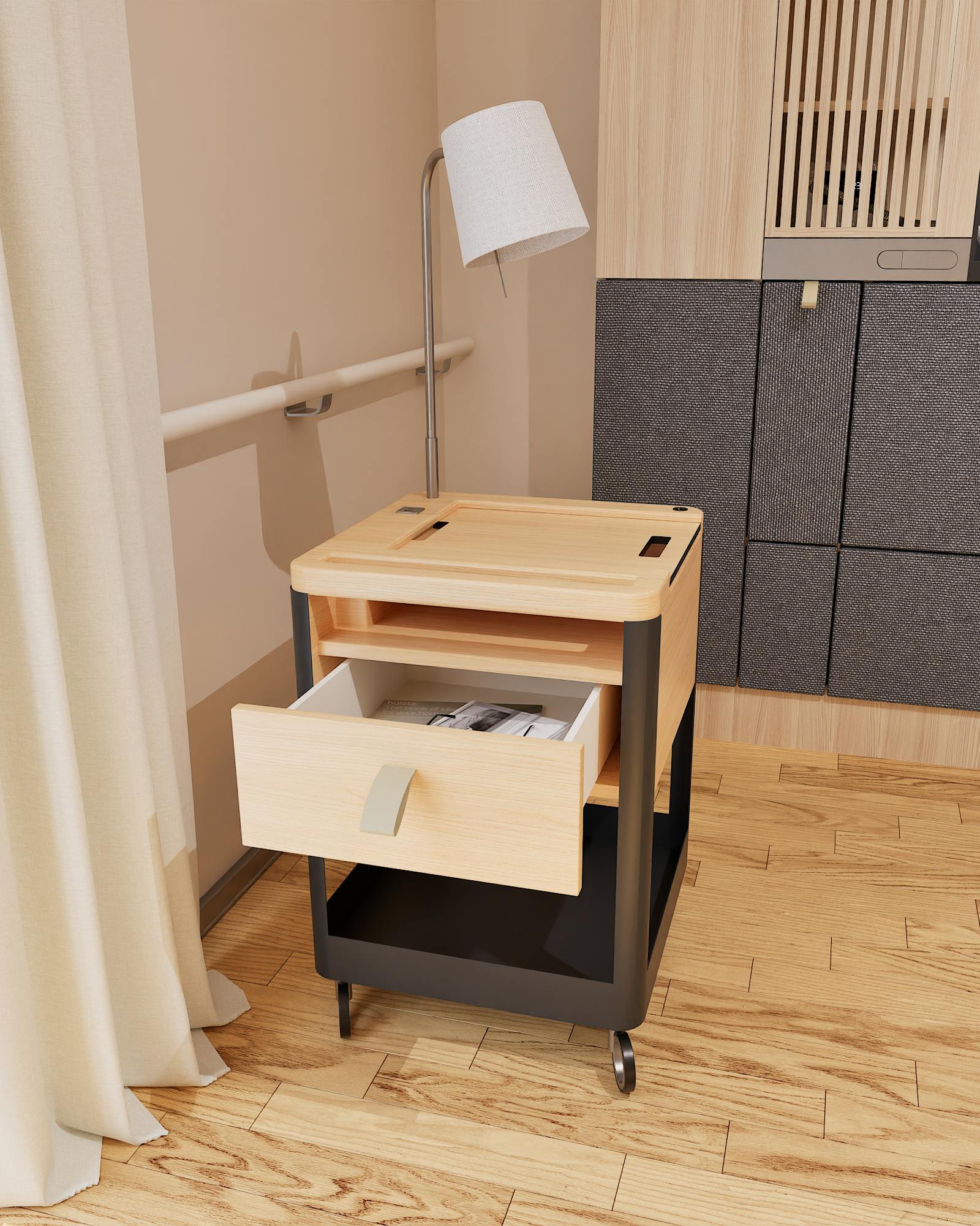 Les espaces de rangement ergonomiques et la tablette dépliante permettent de garder tous les essentiels à portée de main, tandis que les prises de charge intégrées facilitent la recharge des appareils électroniques, ajoutant une touche pratique et moderne à votre espace de nuit.