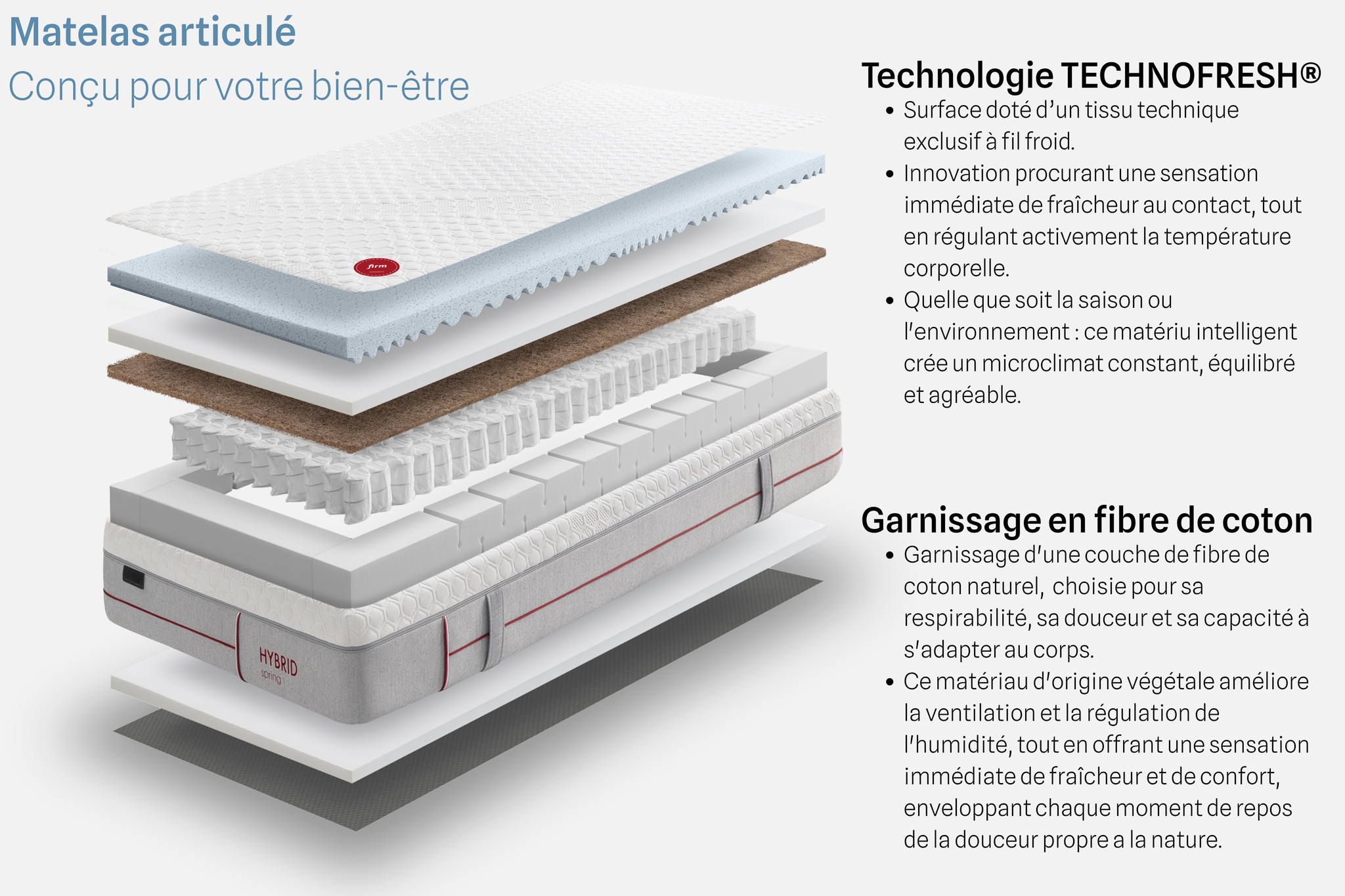 Un matelas articulé qui allie structure, fraîcheur et justesse, pensé pour accompagner les nuits solides et les esprits exigeants.