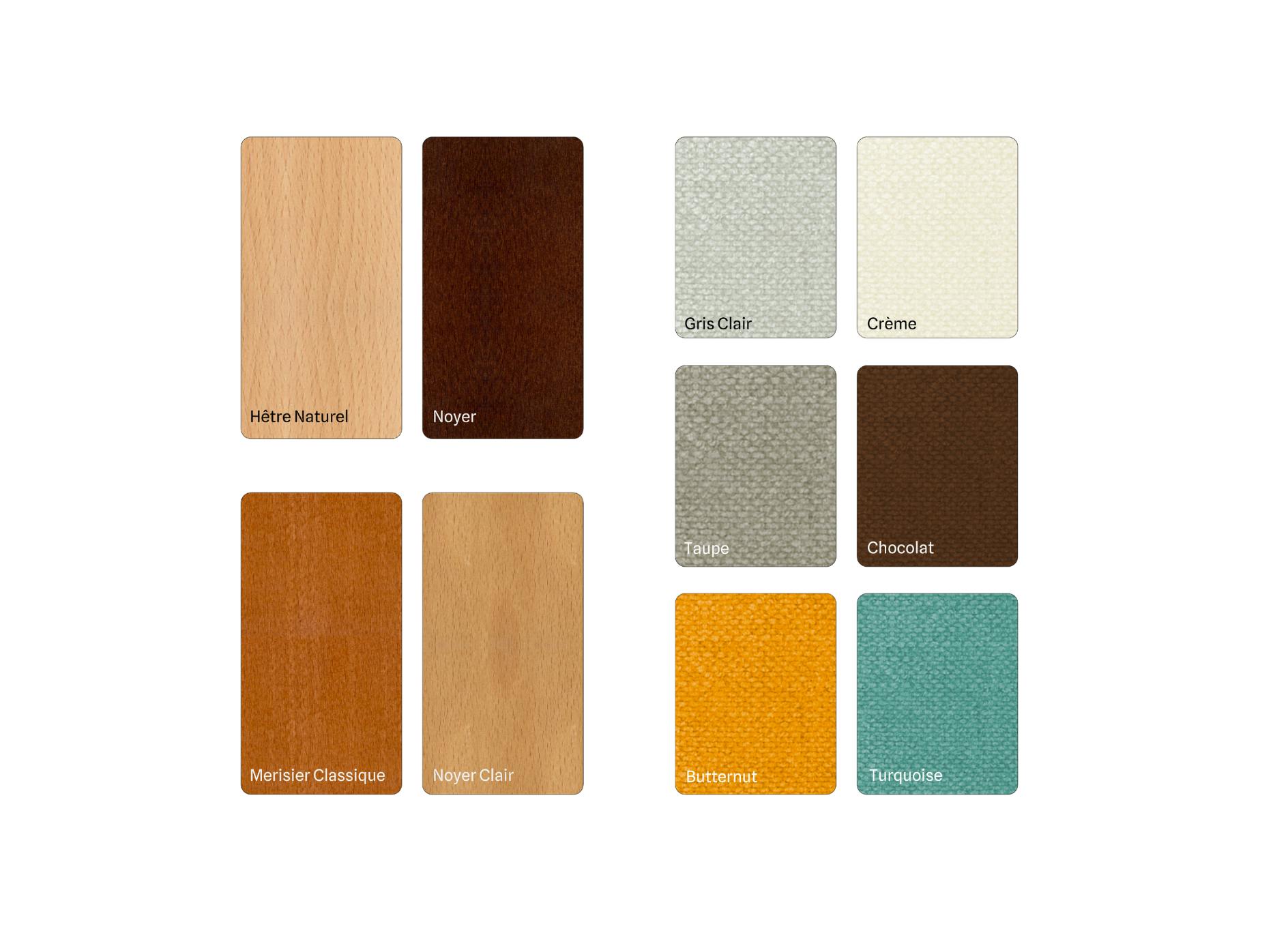 Envie de personnaliser votre fauteuil ? Laissez-vous tenter par notre palette de couleurs : quatre teintes de bois, six nuances en tissu, six autres en simili-cuir.