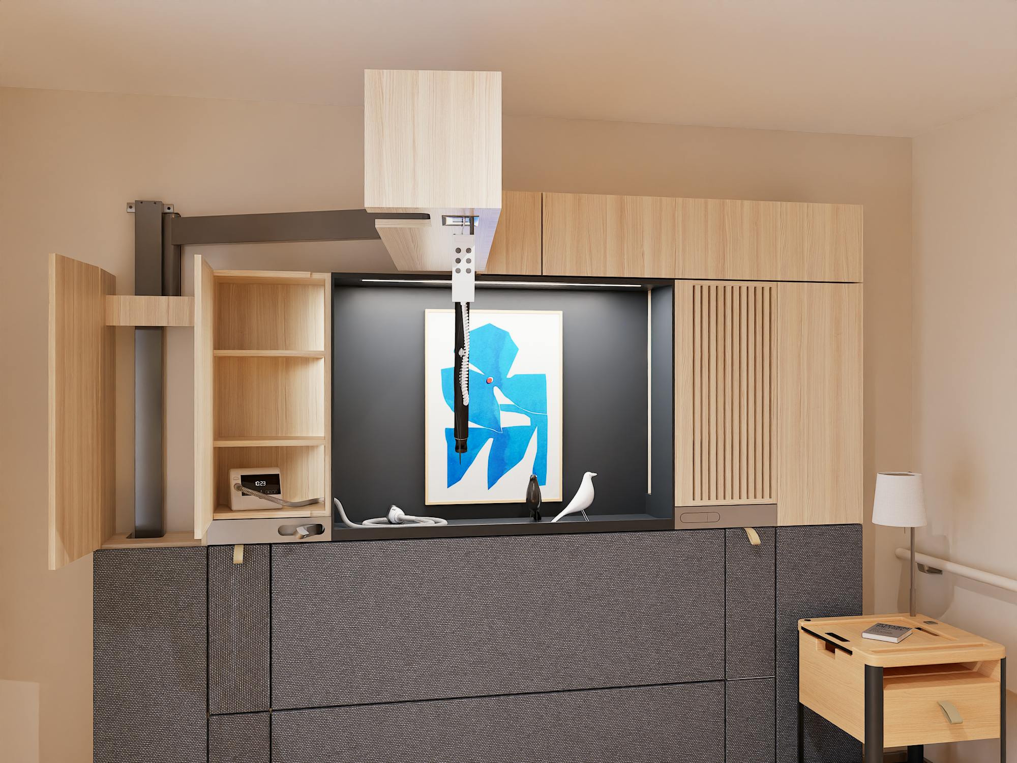 Avec un temps de pose de 4 heures et une garantie de 2 ans, ce mobilier sur-mesure s'adapte aux contraintes techniques spécifiques. Le chevet dépliant et la hauteur variable du lit permettent une utilisation ergonomique au quotidien.