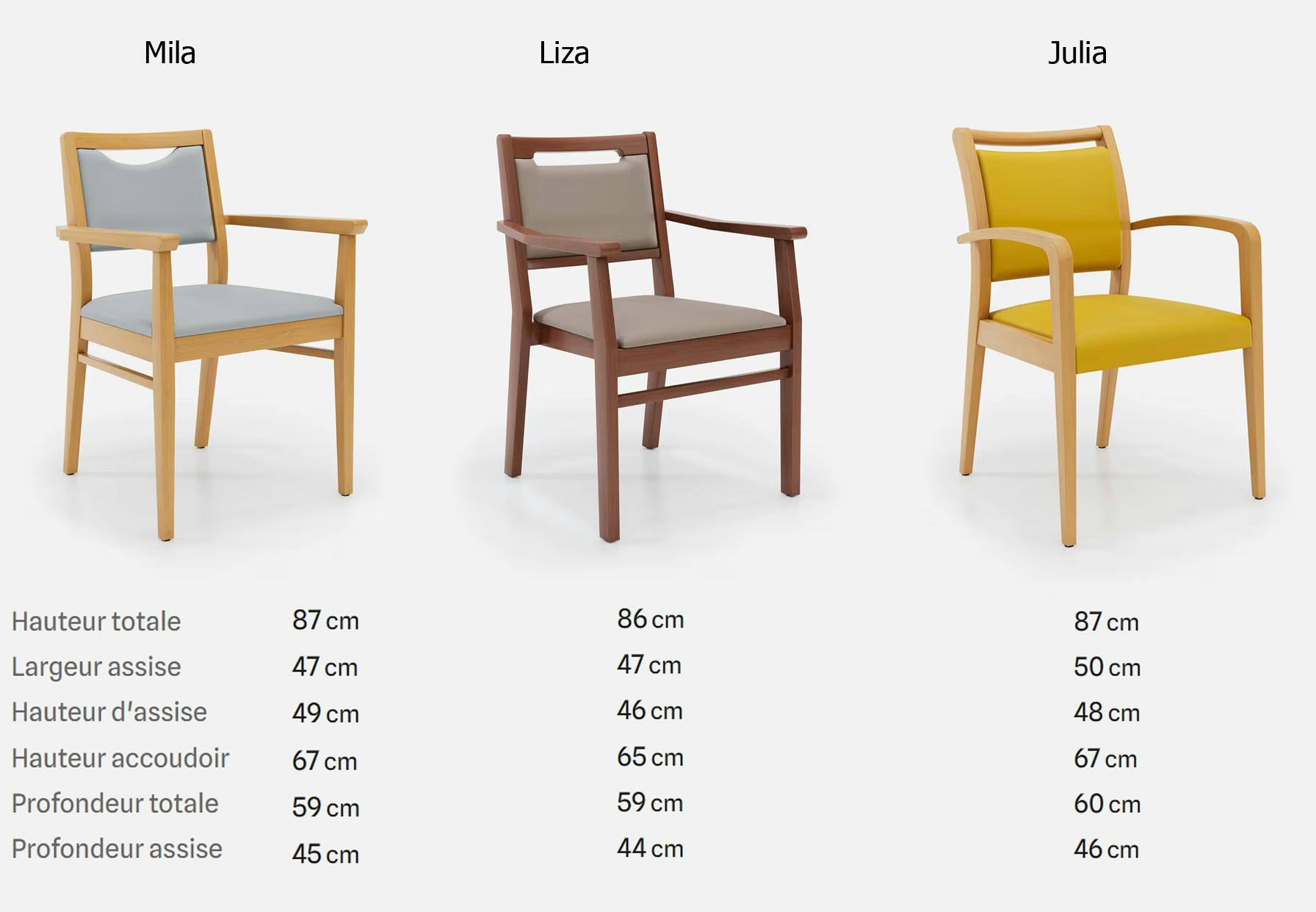 Comme vous pouvez facilement le voir, la chaise qui répondent aux besoins d’une personne petite sont la Liza. Leur hauteur d’assise ainsi que la taille du dossier permettent de profiter pleinement d’un soutien lombaire efficace pour prendre le repas.
